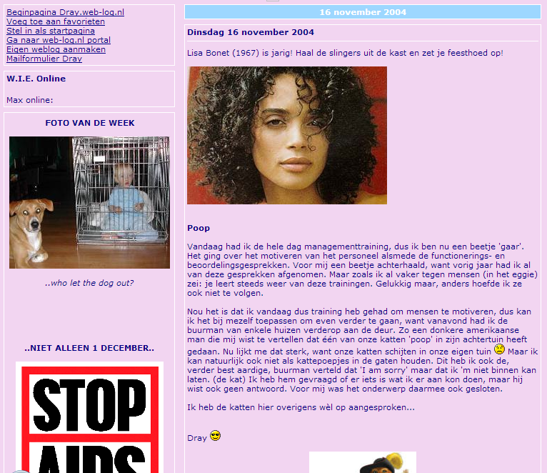 Het voordeel van het bijhouden van een weblog is, dat je -net als met een logboek- bij kunt houden wat en wanneer je iets hebt uitgevoerd. Een hulpstuk aan herinneringen. Zo vind ik het leuk te weten wat ik ongeveer acht jaar geleden hier heb geblogd. Het is niet van belang, maar ik vind het wel entertaining. Ik ga ervan uit dat -wanneer ‘god’ en mijn gezondheid het toelaten- ik nog eens een tiental jaren kan bloggen over van alles en nog niets.