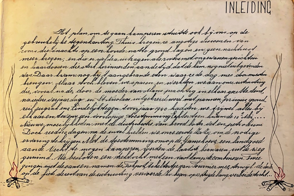 Maar toch bleven we sparen en werkten we aan onze uitrusting die, vooral na de, door de moeder van Mans prachtig in elkaar gezette tent, na iedere verjaardag en St. Nicolaas uitgebreid werd met pannen, primus, grondzeil, rugzak, enzovoort. Eindelijk tegen het voorjaar 1940 hadden we vrijwel alles bij elkaar en tevens een voorlopige toestemming. Echter toen kwam de 10e mei…*