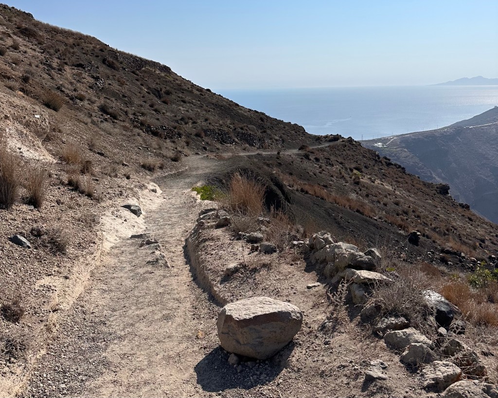 Na het ontbijt maakten we ons klaar voor een wandeling over een wandelpad, waarvan we gisteravond al hadden gelezen dat deze tot aan hoofdstad Fira liep, 10 kilometer verderop. In elk toeristisch vakantieboekje staat dit wandelpad beschreven. Het is een uitdagende route door een vulkaanlandschap; stevige schoenen zijn een must.