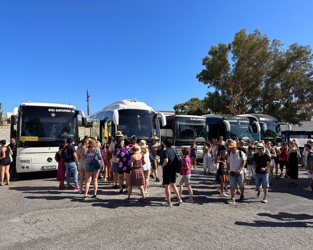 We hadden besloten om met het openbaar vervoer naar de hoofdstad af te reizen en online had ik al eeder wat informatie opgezocht, want mijn OV-chipkaart werkt niet op de Griekse eilanden. Op Santorini betaal je met harde valuta een busreis. Zo’n 100 meter van ons appartement vandaan staat een bushokje waar ieder half uur een bus stopt om reizigers mee te nemen. Zo ook deze ochtend, en om 09:50 uur stapten we in de ge-airconditionde toerbus naar Fira/Thira.