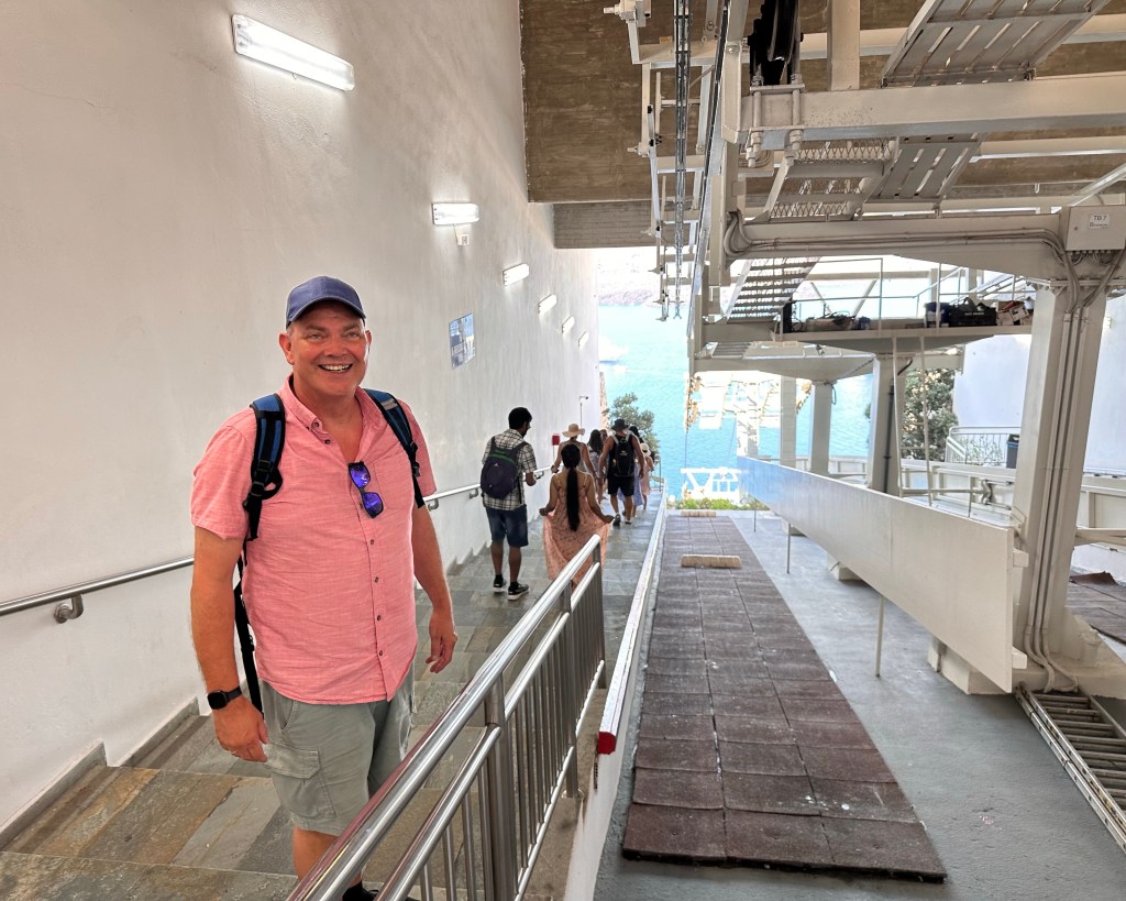 Bij café Aroma, helemaal aan het einde van de havenkom hebben we een cappuccino grande besteld en deze aan de Egeïsche Zee genuttigd. Ook hier hebben we ons lichtelijk verwonderd aan de ‘Mens op Vakantie’. Ik kan nu wel begrijpen dat realityseries succesvol zijn. Wat een typetjes hebben we hier rondlopen. Nadat we onze cappuccino’s hadden afgerekend stond ons een nieuwe uitdaging. Hoe komen we weer boven zonder 588 traptreden te beklimmen en niet 2 uur wachten in een rij, in de brandende zon met honderden cruiseschip-toeristen?