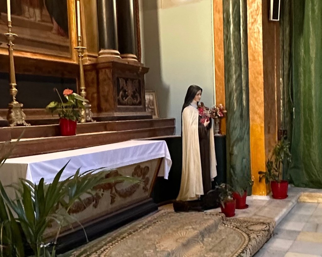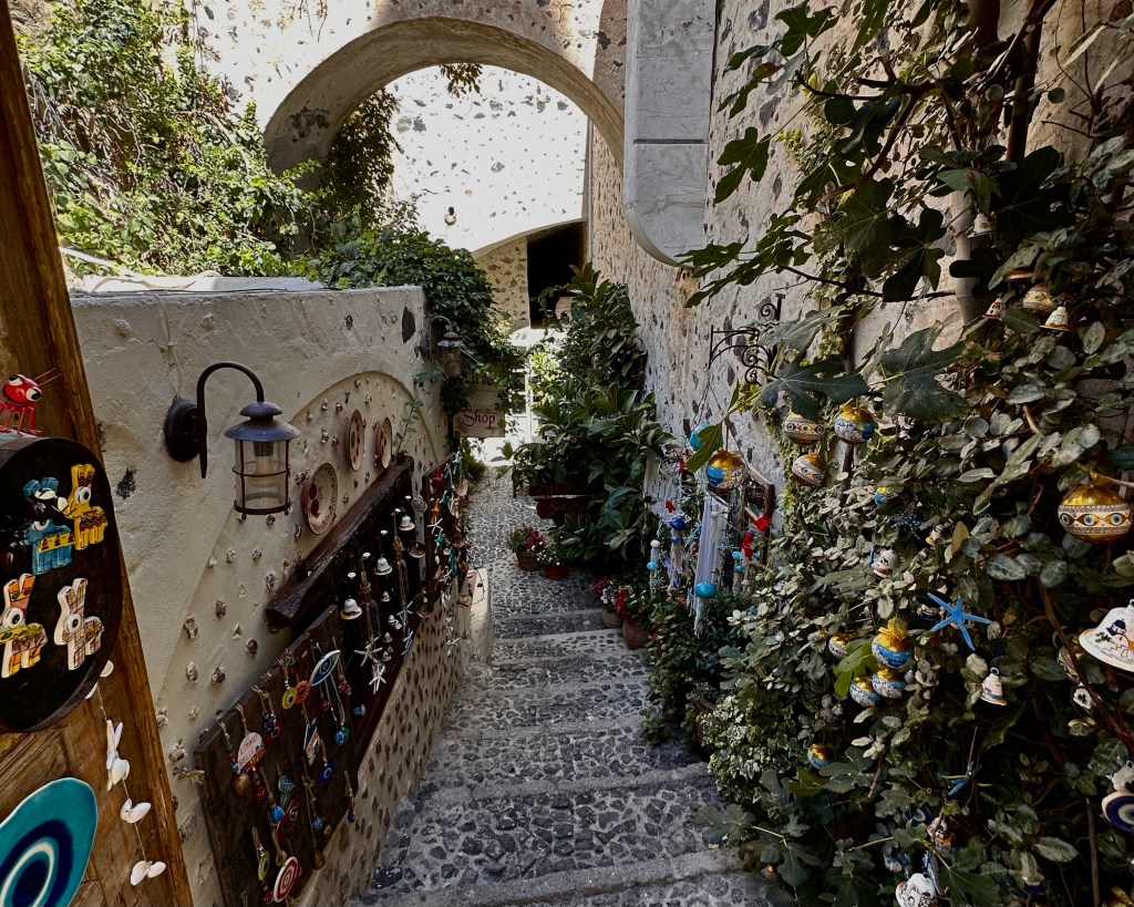 Eenmaal weer boven in Fira/Thira wilde Edo nogmaals een kerkje bezoeken. Dit keer de Katholieke bischopskerk, die in 1832 werd gewijd aan Johannes de Doper. Daar is nog een kaarsje aangestoken en hebben we later, iets verderop heel kort een dienst bijgewoond. Ik voelde me er een indringer (atheïst) en stond snel weer buiten. Mijn religie is eten, dus we gingen op zoek naar een eetgelegenheid. Deze vonden we even verderop: Diverso Bistro.
