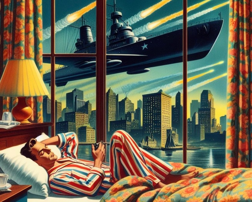 Ik droomde dit keer dat er een wereldbedreigende situatie heerste, waarbij ruimteschepen de Aarde bombardeerden. Ruimteschepen in de meest realistische zin, het waren marineschepen die letterlijk door de lucht vaarden en soort van autoombommen afschoten, waarbij enorme luchtdrukgolven veroorzaakt werden. Het is niet vreemd dat ik na een grote explosie wakker werd. Ik ging er meteen uit voor een nachtelijk bezoek naar het toilet. Alsof mijn instinctieve bewustzijn de ontstane brandjes wilde blussen.