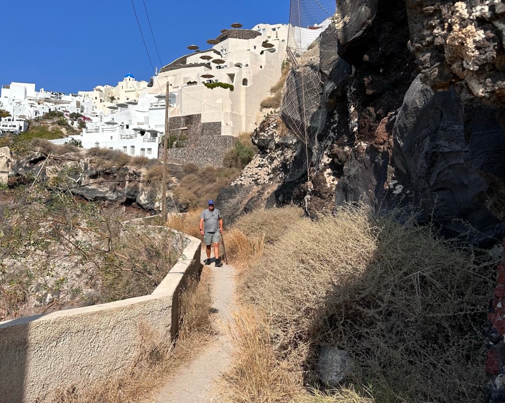 Na het ontbijt maakten we ons klaar voor een wandeling over een wandelpad, waarvan we gisteravond al hadden gelezen dat deze tot aan hoofdstad Fira liep, 10 kilometer verderop. In elk toeristisch vakantieboekje staat dit wandelpad beschreven. Het is een uitdagende route door een vulkaanlandschap; stevige schoenen zijn een must.