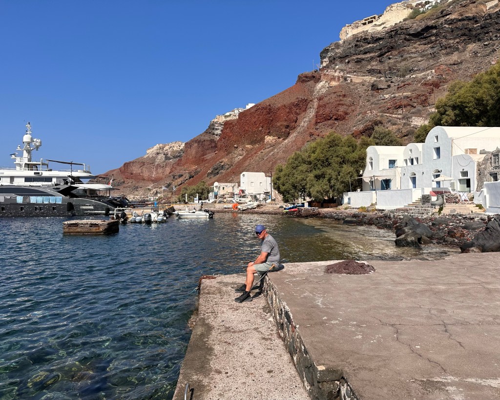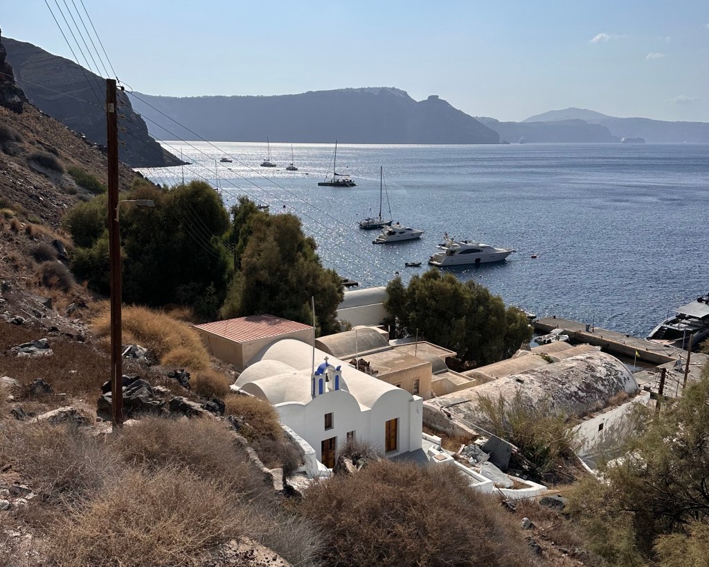 De haven is één van de twee historische havens van Oía, waarin tegenwoordig slechts kleine boten en jachten kunnen aanleggen. In de negentiende eeuw waren hier vele scheepswerven, maar daar zie je nu niets meer van terug. De reisgids van de ANWB vertelde ons dat het haventje zeer rustig is, omdat je er alleen te voet kunt komen via een steil voetpad met deels gladgeslepen treden. De reisgids bleek gelijk te hebben.