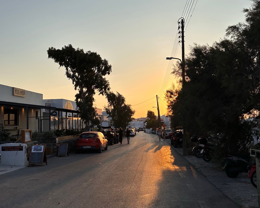 In de avond zijn we weer Oía ingelopen, waar vandaag wel heel veel toeristen in filevorming het stadje wilde binnengaan. Enkelen zullen de zonsondergang op hun mobiele telefoon gemist hebben. Morgen is er voor hen weer een kans. Ter afsluiting hebben we lekker gegeten bij Geogis Kokalis, een restaurant op steenworp afstand van ons verblijf. Nu nog een glaasje wijn en daarna naar bed. Er is nog geen vaste planning, maar morgen is er vast wel weer genoeg te doen.